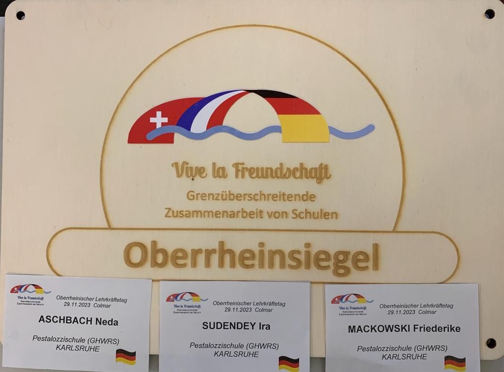 Die Pestalozzischule wurde mit dem Oberrheinsiegel ausgezeichnet. Das Siegel wird an Schulen verliehen, die sich mit grenzüberschreitenden Projekten für Völkerverständigung und Mehrsprachigkeit einsetzen. Der interkulturelle Austausch findet an unserer Schule durch den Austausch mit den Brieffreunden und den gemeinsamen Begegnungen in Straßburg und Durlach statt. Auch im Unterricht wird die interkulturelle Kompetenz, beispielsweise durch eine Projektwoche zum Thema Paris oder das Galette-Fest im Januar, gefördert.
