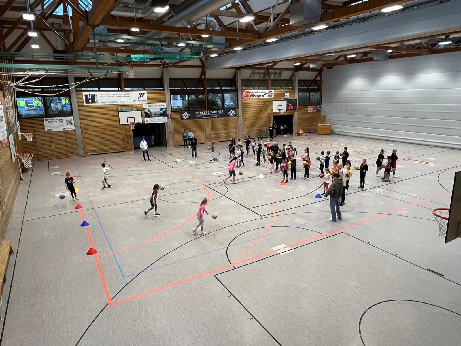 Am Freitag, 28.11.25, fand er statt – der bundesweite Handballaktionstag! Die Pestalozzischule Durlach war in Kooperation mit der TS Durlach wieder dabei. 38 Zweitklässler freuten sich an diesem Tag über ein tolles Ereignis und waren mit Begeisterung dabei. Voll motiviert trafen die Kinder mit ihren Klassenlehrerinnen um 8.30 Uhr an der Weiherhofhalle ein, wo schon von den Trainer*innen der Handballabteilung der TS Durlach verschiedene Stationen zum Training von Koordination, Ballgefühl, Wurftechnik, Geschick, Konzentration, Teamgeist und Kondition aufgebaut waren. Nach einer kleinen Aufwärmrunde ging es dann auch gleich in fünf Gruppen an den Stationen los. Die Gruppen wurden von den Klassenlehrerinnen und den beiden FSJler*innen begleitet. An den Stationen wurden die Kinder von den Trainer*innen der TS Durlach und den Sportmentoren aus der 10. Klasse sowie zwei engagierten Mädels aus der 9. Klasse der Pestalozzischule fachkundig und zugewandt betreut. Zum Abschluss des Tages traten die Schüler*innen in Teams gegeneinander an, um sich im eigentlichen Handballspiel zu messen. Zur Erinnerung gab es für alle Kinder noch eine Urkunde, ein Tattoo sowie ein Infoheftchen mit kindgerechten Erklärungen zum Handballspiel. Im Nachgang reflektierten die Kinder in der Schule den Handballaktionstag und hielten das schönste Erlebnis des Tages in ihrem Portfolio mit einem kleinen Text sowie einem Bild fest. Ein herzliches Dankeschön gilt den Organisator*innen auf Seiten der TS Durlach! Wir freuen uns auf kommendes Jahr, wenn es für die nächsten Zweitklässler heißt: „Lauf dich frei! Ich spiel’ dich an. – Kinder lernen Handball kennen“.