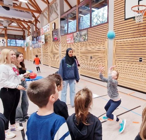 Am Freitag, 28.11.25, fand er statt – der bundesweite Handballaktionstag! Die Pestalozzischule Durlach war in Kooperation mit der TS Durlach wieder dabei. 38 Zweitklässler freuten sich an diesem Tag über ein tolles Ereignis und waren mit Begeisterung dabei. Voll motiviert trafen die Kinder mit ihren Klassenlehrerinnen um 8.30 Uhr an der Weiherhofhalle ein, wo schon von den Trainer*innen der Handballabteilung der TS Durlach verschiedene Stationen zum Training von Koordination, Ballgefühl, Wurftechnik, Geschick, Konzentration, Teamgeist und Kondition aufgebaut waren. Nach einer kleinen Aufwärmrunde ging es dann auch gleich in fünf Gruppen an den Stationen los. Die Gruppen wurden von den Klassenlehrerinnen und den beiden FSJler*innen begleitet. An den Stationen wurden die Kinder von den Trainer*innen der TS Durlach und den Sportmentoren aus der 10. Klasse sowie zwei engagierten Mädels aus der 9. Klasse der Pestalozzischule fachkundig und zugewandt betreut. Zum Abschluss des Tages traten die Schüler*innen in Teams gegeneinander an, um sich im eigentlichen Handballspiel zu messen. Zur Erinnerung gab es für alle Kinder noch eine Urkunde, ein Tattoo sowie ein Infoheftchen mit kindgerechten Erklärungen zum Handballspiel. Im Nachgang reflektierten die Kinder in der Schule den Handballaktionstag und hielten das schönste Erlebnis des Tages in ihrem Portfolio mit einem kleinen Text sowie einem Bild fest. Ein herzliches Dankeschön gilt den Organisator*innen auf Seiten der TS Durlach! Wir freuen uns auf kommendes Jahr, wenn es für die nächsten Zweitklässler heißt: „Lauf dich frei! Ich spiel’ dich an. – Kinder lernen Handball kennen“.
