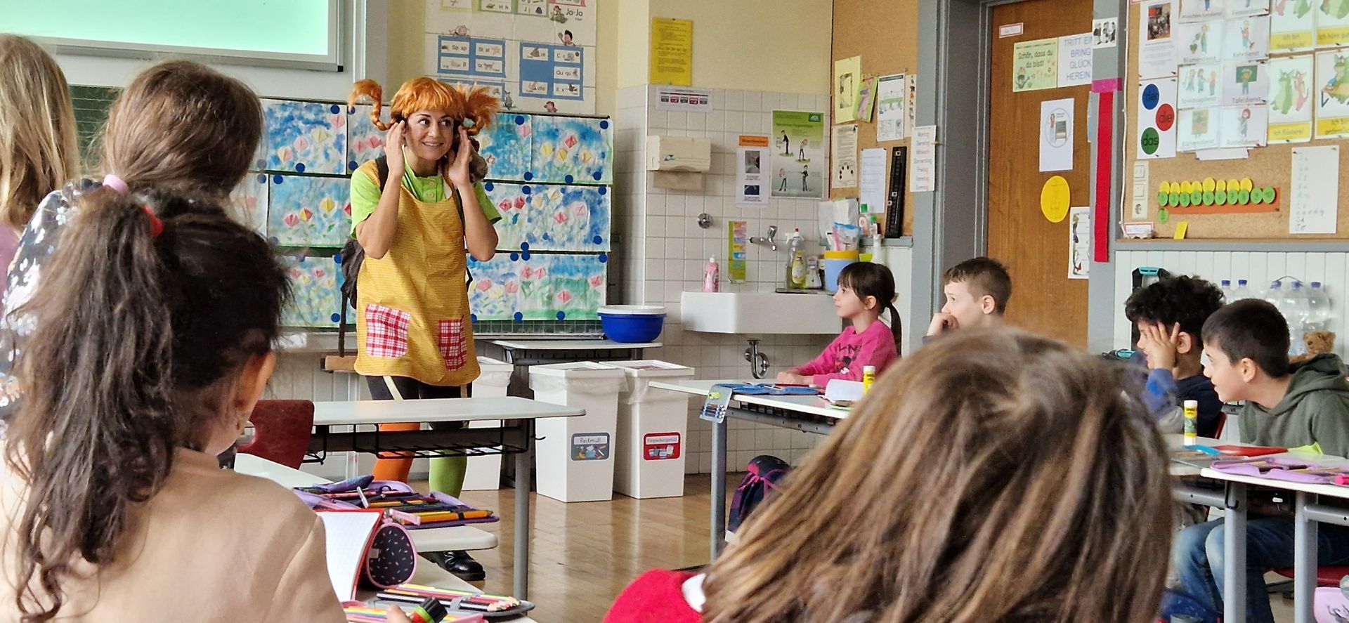 "Pippi war so lustig. Sie war richtig frech zu unserer Lehrerin. Wir haben uns kaputt gelacht. Pippi hatte ganz bunte Sachen an und eine kaputte Strumpfhose. Sie hat Würstchen gegessen. Sie hat uns vorgelesen. Sie hat ganz laut gesungen. Wir durften die Füße auf den Tisch legen. Es war toll mit Pippi."