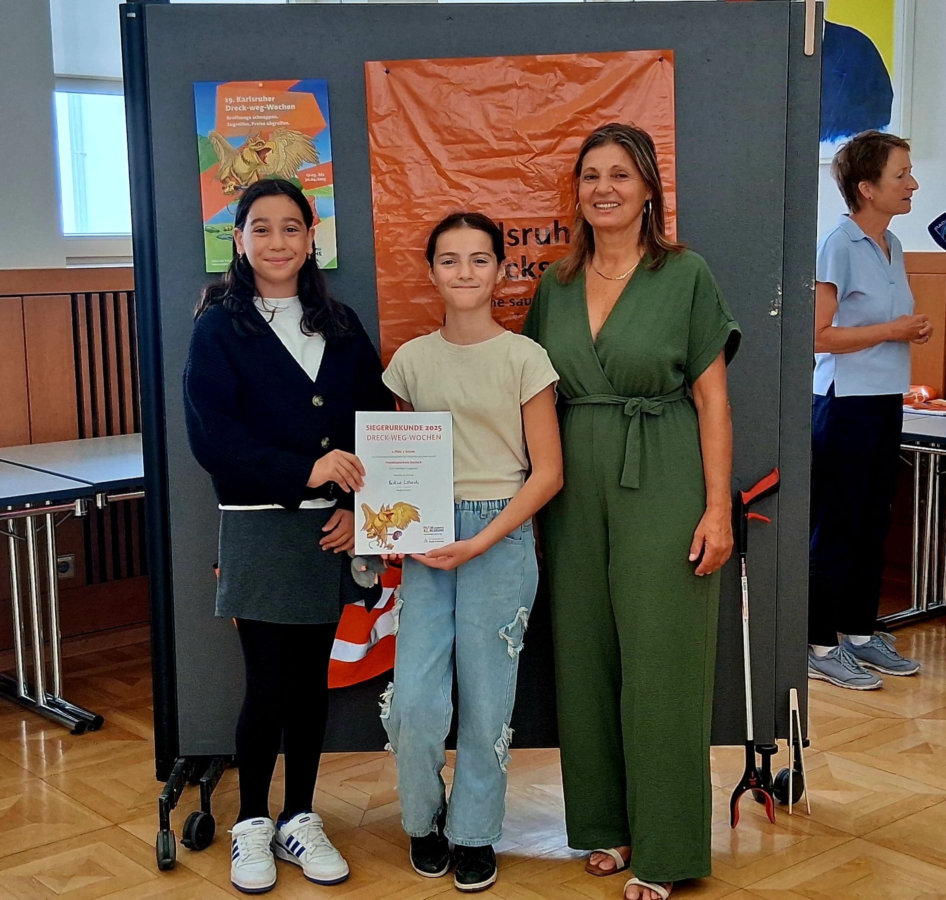Die PESTA hat den 1. Preis gewonnen. Rund 15.000 Menschen, verschiedene Vereine und 64 Klassen haben sich an den "Dreck-weg-Wochen" der Stadt beteiligt. An der PESTA gab es 12 fleißige Klassen, die mitgemacht haben. Das ist superklasse und wurde nun auch mit einer Urkunde belohnt, denn an keiner anderen Schule der Stadt Karlsruhe gab es so viele Dreck-weg-SammlerInnen wie bei uns.